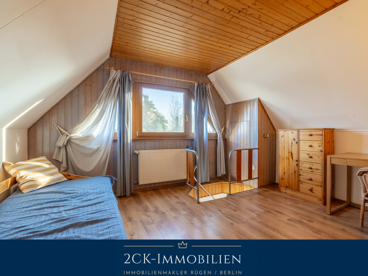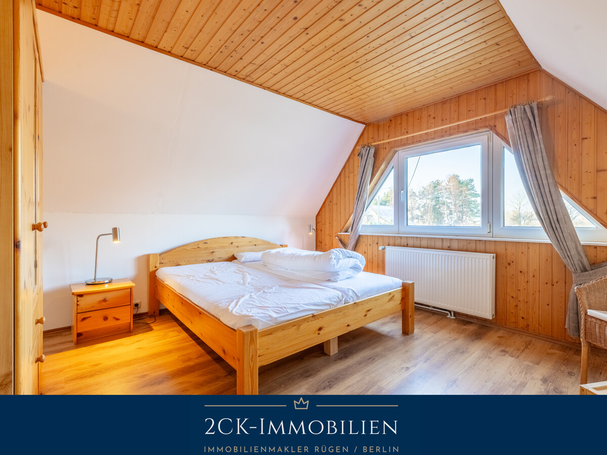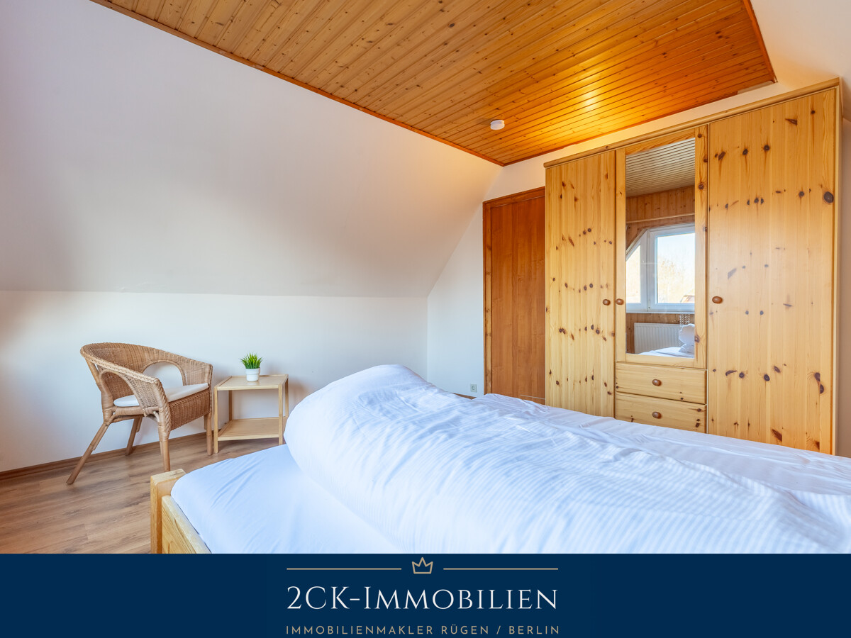 Das Dachgeschoss beherbergt zwei weitere Schlafzimmer. Ein Highlight ist hier das Zimmer mit direktem Blick auf den Bodden – ein Ausblick, der die Lage in Neuhof so besonders macht.