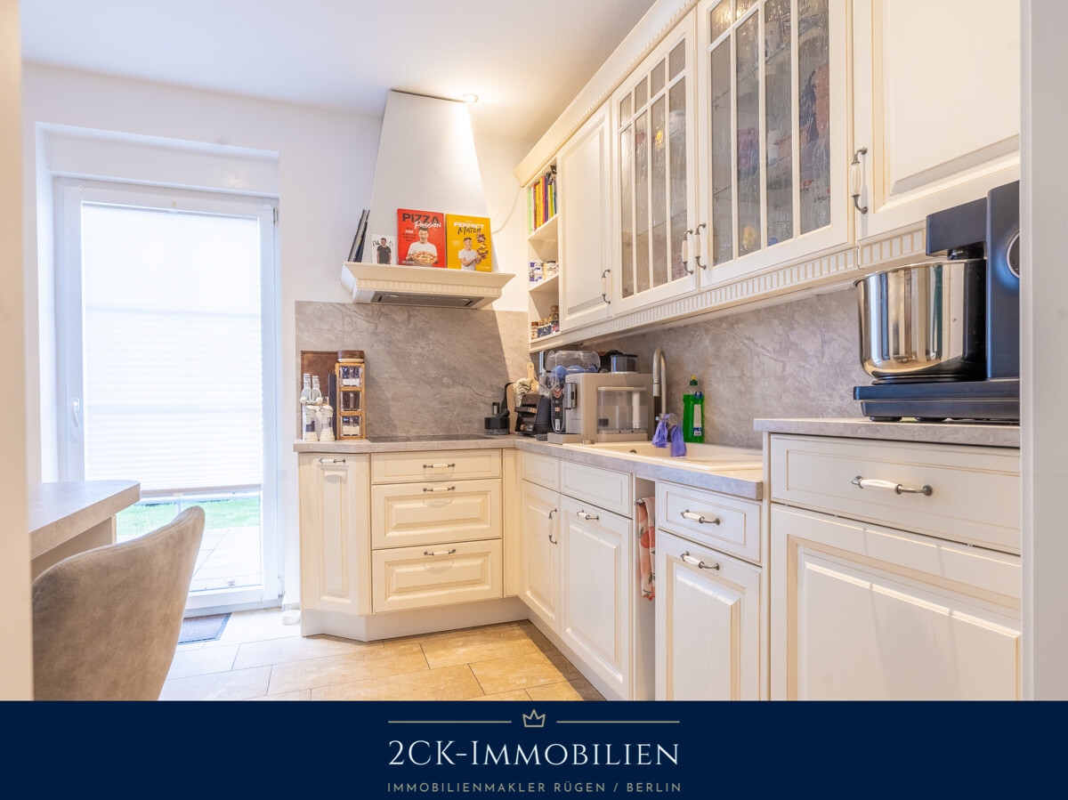Wohnen und Leben im Erdgeschoss: Der Mittelpunkt des Hauses ist der großzügige Wohnbereich. Ausgestattet mit einer durchgängigen Fußbodenheizung, bietet dieser Raum zu jeder Jahreszeit ein angenehmes Klima. Ein besonderes Highlight für die kühleren Tage auf der Insel ist der neue Kaminofen (Baujahr 2023), der nicht nur Wärme, sondern echte Gemütlichkeit spendet. Angrenzend finden Sie die voll ausgestattete Einbauküche. Gehalten im zeitlosen Landhausstil und bestückt mit hochwertigen Markengeräten, fügt sie sich harmonisch in das Gesamtbild ein und bietet viel Platz für kulinarische Kreativität.