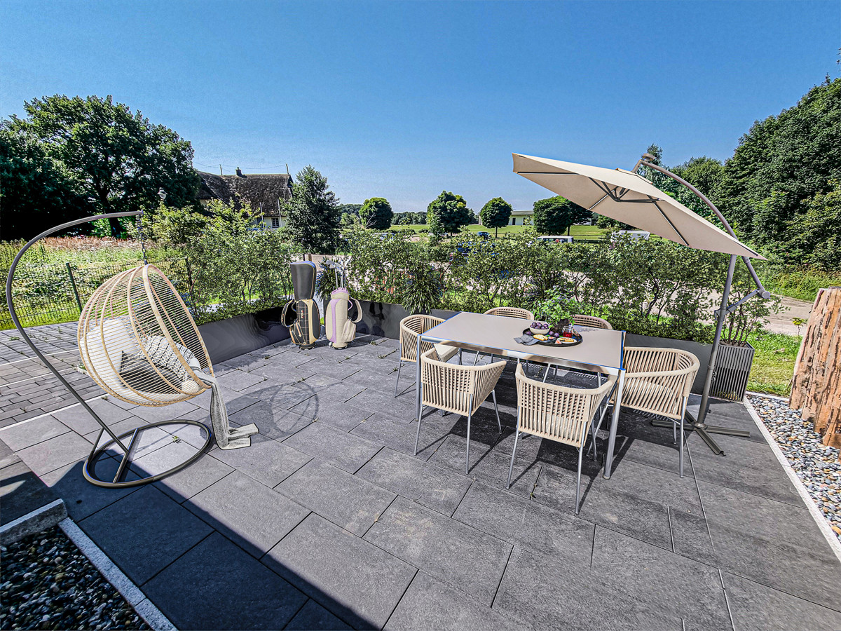 Besonders erwähnenswert ist die nach süd-west ausgerichtete Terrasse mit Blick auf das Clubhaus. Die 20 m² große Terrasse ist ideal für entspannte Stunden im Freien und bietet einen schönen Ausblick auf das Clubhaus des Golfplatzes.