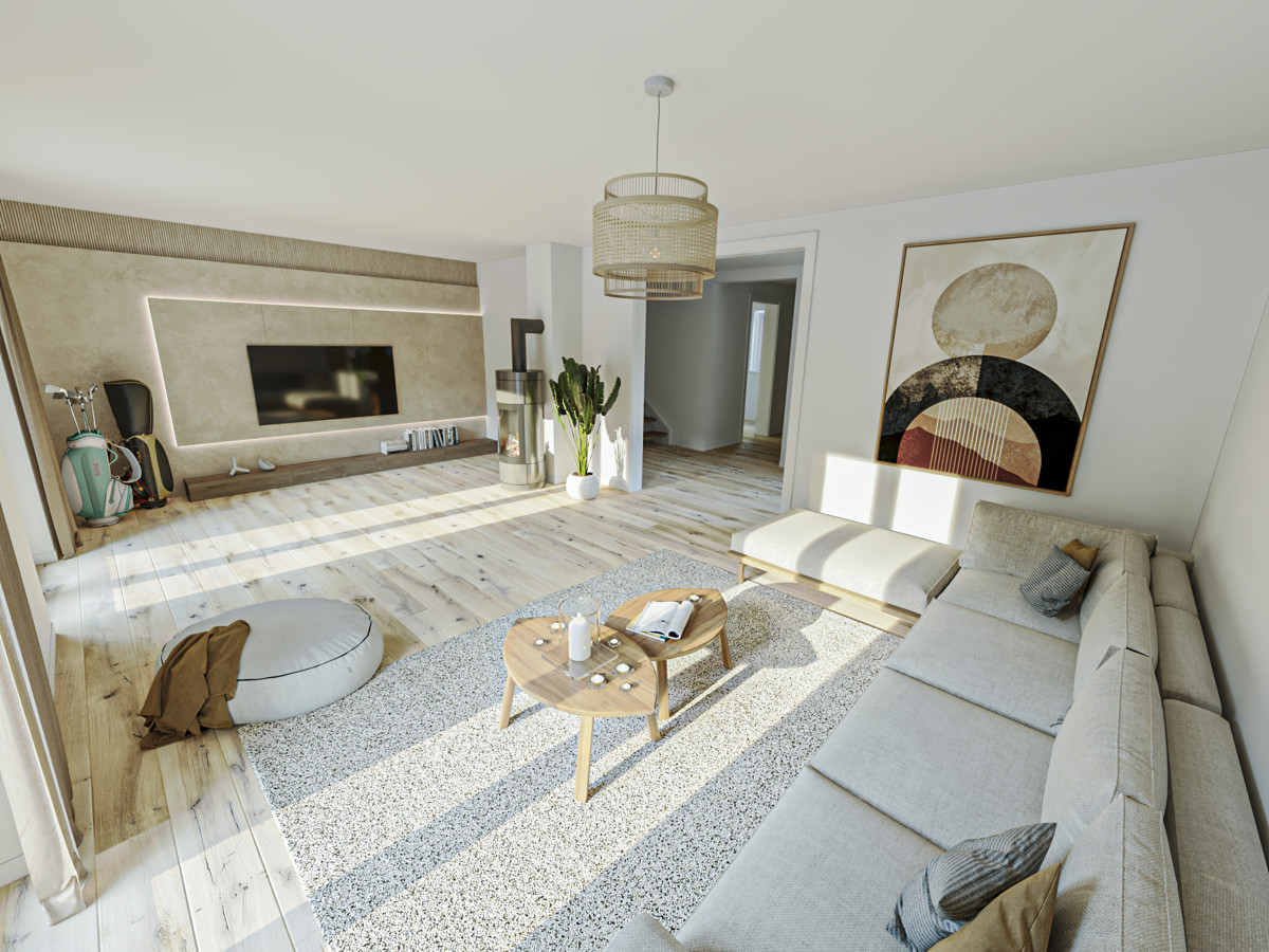 Der großzügige Wohn- und Essbereich bietet viel Platz für Möbel und Gestaltungsmöglichkeiten. Die Option, einen Kamin zu installieren, schafft zusätzlich Gemütlichkeit.