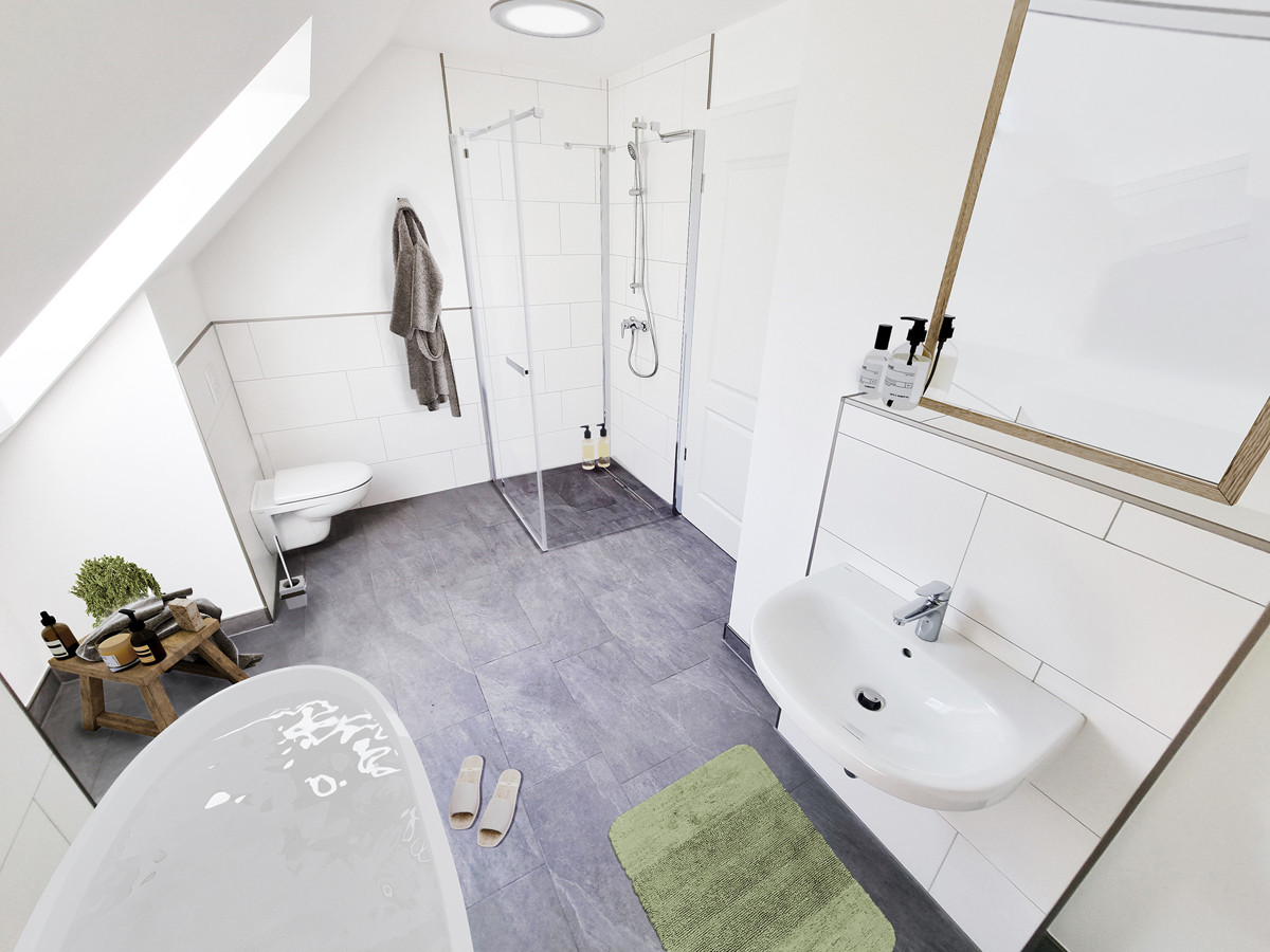 Das tagesbelichtete Badezimmer mit freistehender Badewanne und ebenerdiger Dusche bietet einen Hauch von Luxus. Im EG steht Ihnen ein Gäste-WC zur Verfügung