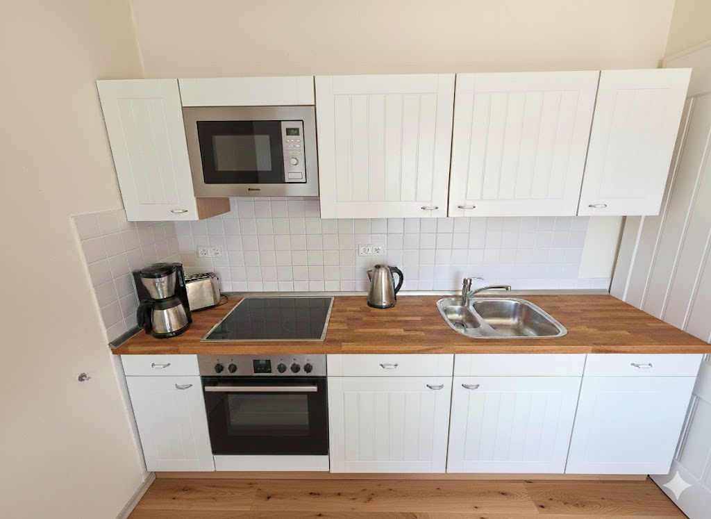 Schon beim Öffnen der Tür spüren Sie die warme Herzlichkeit dieses Zuhauses: Licht durchflutet den Wohn- und Essbereich mit ausziehbarer Schlafcouch, der mit einer Einbauküche zum gemeinsamen Kochen und Wohlfühlen einlädt. Hier entstehen Herzmomente zu zweit oder mit Freunden – lautlos summt der Alltag, während draußen die Wellen ihre eigene Melodie spielen.