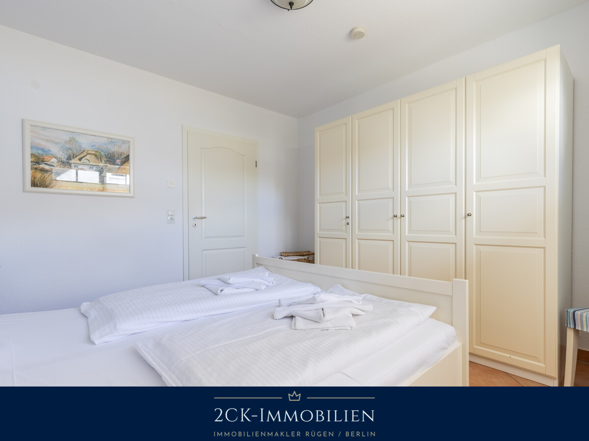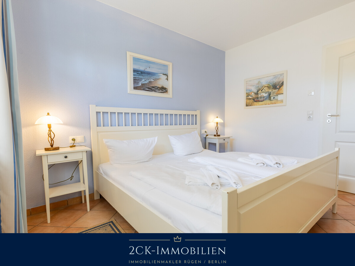 Das Schlafzimmer bietet einen ruhigen Rückzugsort, während das tagesbelichtete Badezimmer mit Dusche den 4-Sterne-Komfort perfekt abrundet. Von der sonnigen Süd-Terrasse öffnet sich der Blick über den Bodden bis zu den sanften Höhen der Zickerschen Berge – ein Panorama, das zu jeder Tageszeit verzaubert. Für zusätzliche Entspannung sorgt die Möglichkeit zur Saunanutzung – ideal, um nach einem langen Spaziergang an der See die Seele baumeln zu lassen.