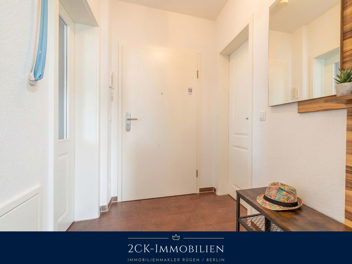Der Ortsteil Thiessow liegt auf der südlichsten Landzunge der Halbinsel Mönchgut im Biosphärenreservat Südost-Rügen. Die Lage ist naturnah und von drei Seiten von Wasser umgeben (Ostsee und Greifswalder Bodden). Die Wohnung befindet sich direkt am Deich – der feinsandige Ostseestrand ist in wenigen Metern zu Fuß erreichbar. Im Gegensatz zu den großen Ostseebädern wie Binz oder Sellin geht es in Thiessow ruhiger zu, ideal für Naturliebhaber und Wassersportler.