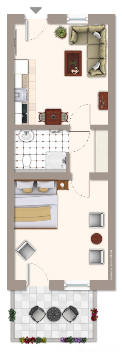 Die Wohnung verfügt über einen Balkon mit Südausrichtung. Hier können Sie die Sonne tagsüber nutzen und abends den Blick in den Sonnenuntergang genießen.