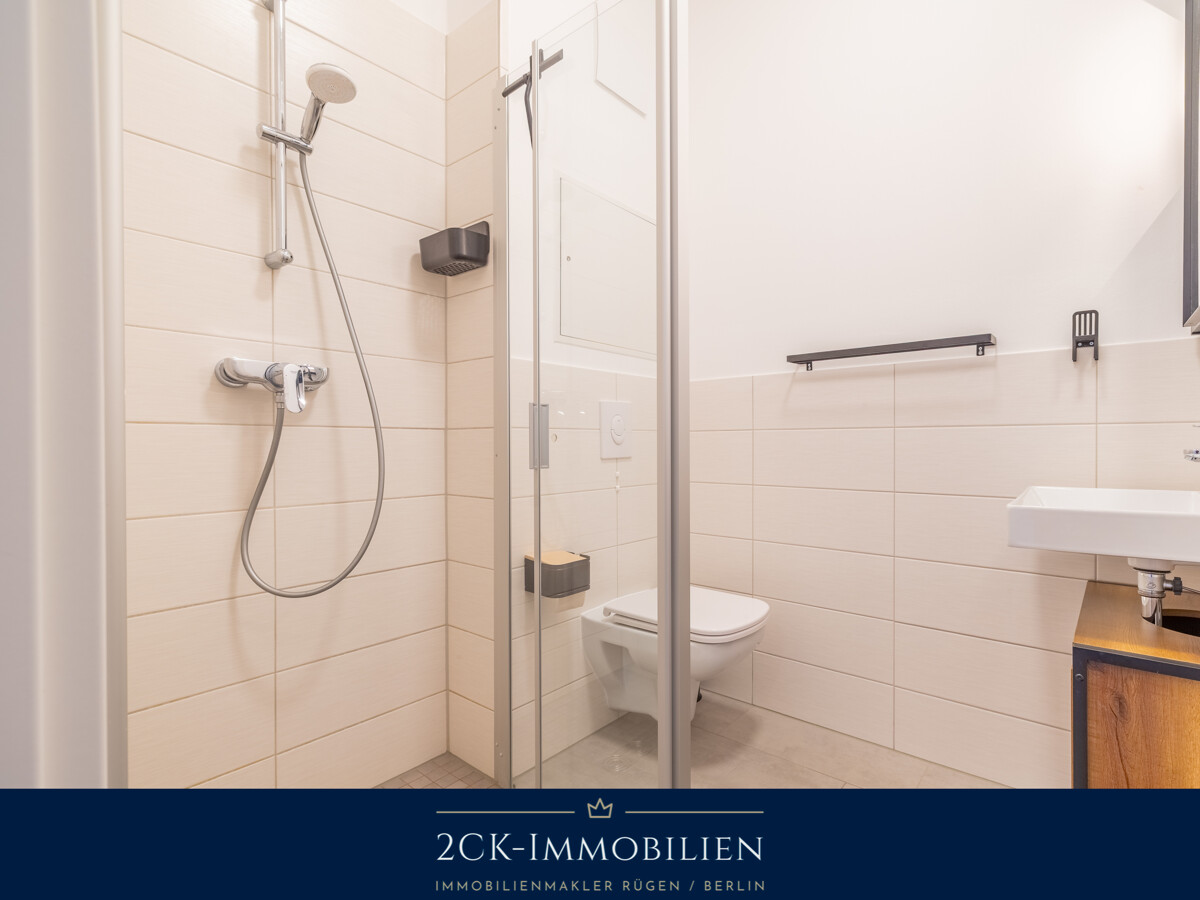 Das Badezimmer ist funktional und modern gestaltet und bietet eine komfortable, ebenerdige Dusche.
